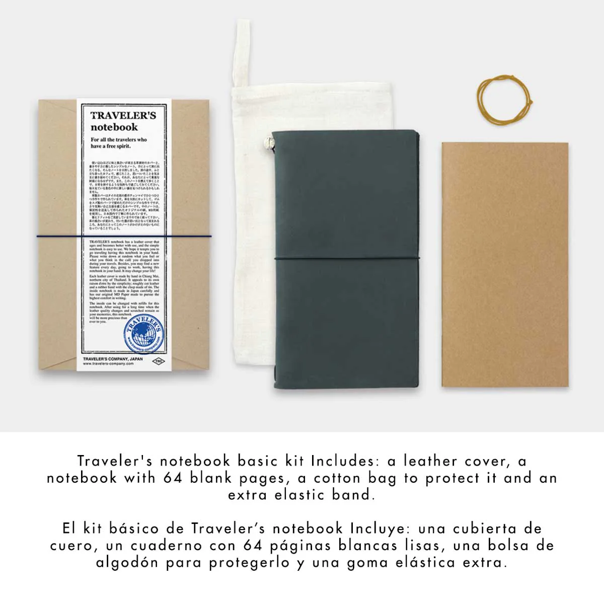 Kit básico del TRAVELER'S Notebook tamaño regular. Incluye una cubierta de cuero, un cuaderno con 64 páginas blancas lisas, una bolsa de algodón para protegerlo y una goma elástica extra.